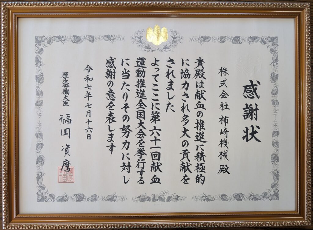2025年9月30日 / 最終更新日時 : 2025年10月1日 admin お知らせ 厚生労働大臣より感謝状を拝受いたしました 2025年7月30日長年にわたる献血への協力が評価され、厚生労働大臣より感謝状を拝受いたしました。